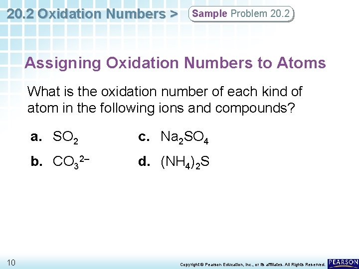 PDF Assigning oxidation numbers practice worksheet answer key A pure element has an oxidation number of 0.2. The oxidation number of an element in a monatomic ion equals the charge of the ion.3. The sum of the oxidation number of all the elements in a compound equals 0.4. The sum of the oxidation numbers of all the elements in a polyatomic ion equals the charge onthe ion.Directions: In the following ...