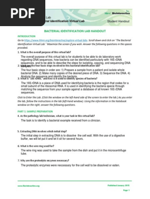 Bacterial Identification Lab Worksheet.pdf - Course Hero Published January 2015 Page 1 Student Handout Virtual Lab Bacterial Identification Virtual Lab BACTERIAL IDENTIFICATION LAB HANDOUT INTRODUCTION Go to.Scroll down and click on "The Bacterial Identification Virtual Lab." Maximize the screen if you wish. Answer the following questions in the spaces provided. 1. What is the overall purpose of this virtual lab?