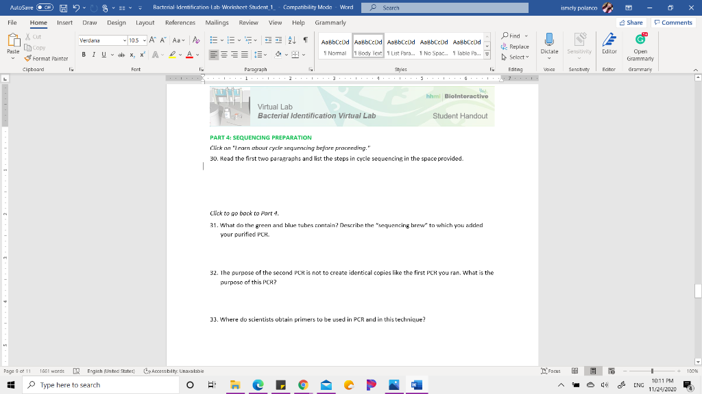 1. Bacterial-Identification-Lab-Worksheet-Student.pdf Bacterial-Identification-Lab-Worksheet-Student.pdf from MICROBIOLO V01 at Moorpark College. Virtual Lab Bacterial Identification Virtual Lab Student Handout BACTERIAL IDENTIFICATION LAB. Study Resources. Main Menu; by School; ... #13. Answer: Mainly, the Master Mix contains water; a buffer to keep the mixture at the correct pH for the PCR ...