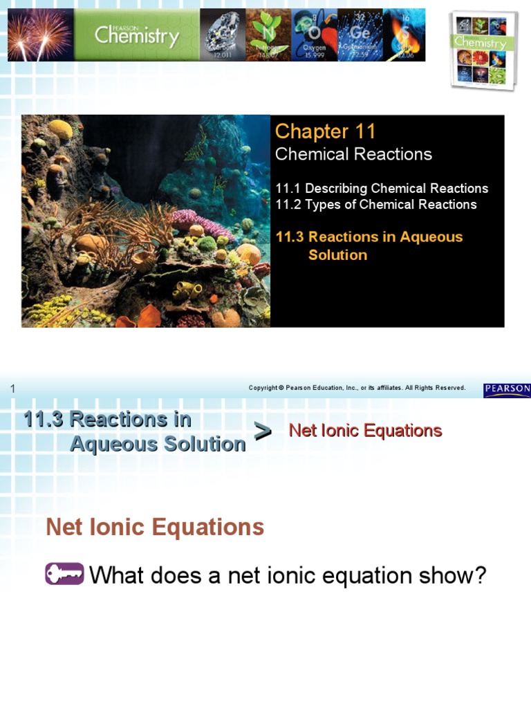 11.3 Reactions in Aqueous Solution - Quia (aq) + NaCl(aq) → AgCl(s) + NaNO 3 (aq) •When sodium chloride dissolves in water, it separates into sodium ions (Na+(aq)) and chloride ions (Cl-(aq)). •When dissolved in water, silver nitrate dissociates into silver ions (Ag+(aq)). 11.3 Reactions in Aqueous Solution 9 > Net Ionic Equations