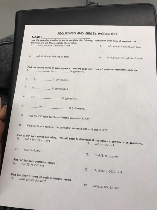 Sequences worksheets and online exercises Sequences worksheets and online activities. Free interactive exercises to practice online or download as pdf to print. ... Geometric Series Grade/level: 10 by qpdomasig: Quadratic Sequence Review Grade/level: Grad 7, 8 by Mr_Y_Class: Number patterns Grade/level: Grade 5 by ngocvien24: Sequences Sequence and Series Worksheet (updated- 2021-2022) -CoolGyan The sequence and series worksheet help the students in scoring good marks in the final examination. The Sequence and Series Worksheets helps the students on various aspects and topics which are below-. Provides an idea of how to find the next terms of a given sequence by the use of explicit and recursive formulas. cdn.kutasoftware.com › Worksheets › Alg2Arithmetic Sequences Date Period - Kuta Software ©y j2G0w1 62b UKVuutoa X bSAoAf1tBw ea orJe Y CLZL QCH.Z Z AAlJl9 Rr Miegph ptfs t prqe MsPeArWv9e LdP. f p TMoaSdOew Wwbi wt6hi WI4nXf 1i2nFiOtKeH uA ol mgYevbkr Zae 12 O.e Worksheet by Kuta Software LLC Given a term in an arithmetic sequence and the common difference find the first five terms and the explicit formula. 15) a 38 = −53.2 , d ...