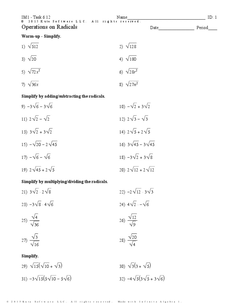 Operations with radicals worksheet. Free Printable Math Worksheets for Pre-Algebra - Kuta Software Free Pre-Algebra worksheets created with Infinite Pre-Algebra. Printable in convenient PDF format. Operations with Radicals Worksheets - Math Kick-start your preparation with this set of radical operations worksheets and learn to fluently add, subtract, multiply and divide radical expressions. Adding and Subtracting Integers Worksheets This assortment of adding and subtracting integers worksheets have a vast collection of printable handouts to reinforce performing the operations of addition and subtraction on integers among 6th grade, 7th grade, and 8th grade students. Adding, Subtracting, Multiplying Radicals - Kuta Software ©5 X280g1 M2n cK nuNtba 5 PSdodf Ctew Ka8roeh 2LgL HCc. V c JA 4lSlO crai Eg 9hgt 7sn broePsfe0rcv ieodD.7 Y xMEaZdpef Zwgiyt9h O uI 2n8f aiXnCiGtdeI RAZlMgae 6b Arfae w2s.u Worksheet by Kuta Software LLC 13) 3 3 ⋅ 3 −20 − 3 60 14) 5 ⋅ 3 15 15) 6 ⋅ 2 2 3 16) 3 3 ⋅ 3 9 3 17) 3 3(4 − 3 5) 12 3 − 9 15 18) 4 15 (−3 6 + 5)
