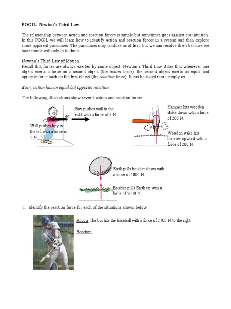 Newton's third law worksheet answers. › Physics-InteractivesPhysics Simulation: Free-Body Diagrams - Physics Classroom Newton's Laws. Balanced vs. Unbalanced Forces; Change of State; Fnet = m•a; Force and Motion; Mass and Weight; Match That Free-Body Diagram; Net Force (and Acceleration) Ranking Tasks; Newton's Second Law; Normal Force Card Sort; Recognizing Forces; Air Resistance and Skydiving; Solve It! with Newton's Second Law; Which One Doesn't Belong ... › class › newtlawsFree Fall and Air Resistance - Physics Classroom To answer the above questions, Newton's second law of motion (F net = m•a) will be applied to analyze the motion of objects that are falling under the sole influence of gravity (free fall) and under the dual influence of gravity and air resistance. › class › newtlawsDrawing Free-Body Diagrams - Physics Classroom Answers. Answers to the above exercise are shown here. If you have difficulty drawing free-body diagrams, then you ought to be concerned. Continue to review the the list of forces and their description and this page in order to gain a comfort with constructing free-body diagrams. Snoqualmie Valley School District / District Homepage Snoqualmie Valley School District / District Homepage
