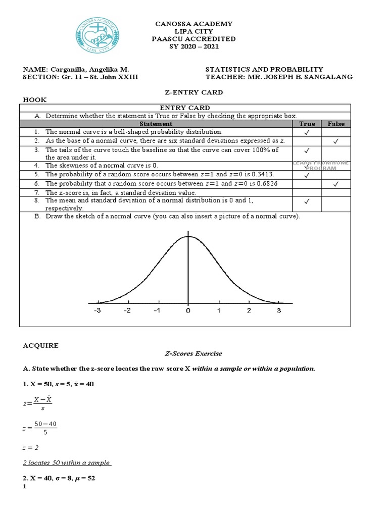 Z score practice worksheet. Z Score - Formula, Meaning, Examples - Cuemath Important Notes on Z Score. Z score is a statistical measure that is used to determine the distance of a raw score from the mean by measuring the standard deviations. A z score can be positive, negative, or zero. The z score formula is given as \(\frac{x-\mu}{\sigma}\). To find the percentile of a z score, a z table is used. Digital Object Identifier System This is the web site of the International DOI Foundation (IDF), a not-for-profit membership organization that is the governance and management body for the federation of Registration Agencies providing Digital Object Identifier (DOI) services and registration, and is the registration authority for the ISO standard (ISO 26324) for the DOI system. The DOI system provides a … Z-Score Practice Worksheet Z-Score Practice Worksheet Name _____________________________ A normal distribution of scores has a standard deviation of 10. Find the z-scores corresponding to each of the following values: A score that is 20 points above the mean. z=2 A score that is 10 points below the mean. z=-1 A score that is 15 points above the mean z=1.5 Z-Score Practice Worksheet - DocsLib Z-Score Practice Worksheet. Name _____ Period: _____ Z-Score. 1. A normal distribution of scores has a standard deviation of 10. Find the z-scores corresponding to each of the following values: a) A score of 60, where the mean score of the sample data values is 40. b) A score of 80, where the mean score of the sample data values is 30.