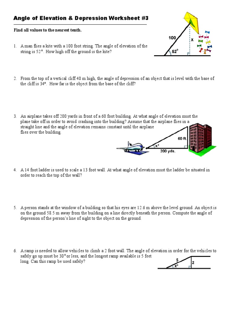 Angle of Elevation and Depression Worksheet Angle of Elevation & Depression Worksheet (Cont.) Find all values to the nearest tenth. 5. A man flies a kite with a 100 foot string. The angle of elevation of the 52string is o . How high off the ground is the kite? 6. From the top of a vertical cliff 40 m high, the angle of depression of an object that is level with the base of the cliff is 34ยบ.