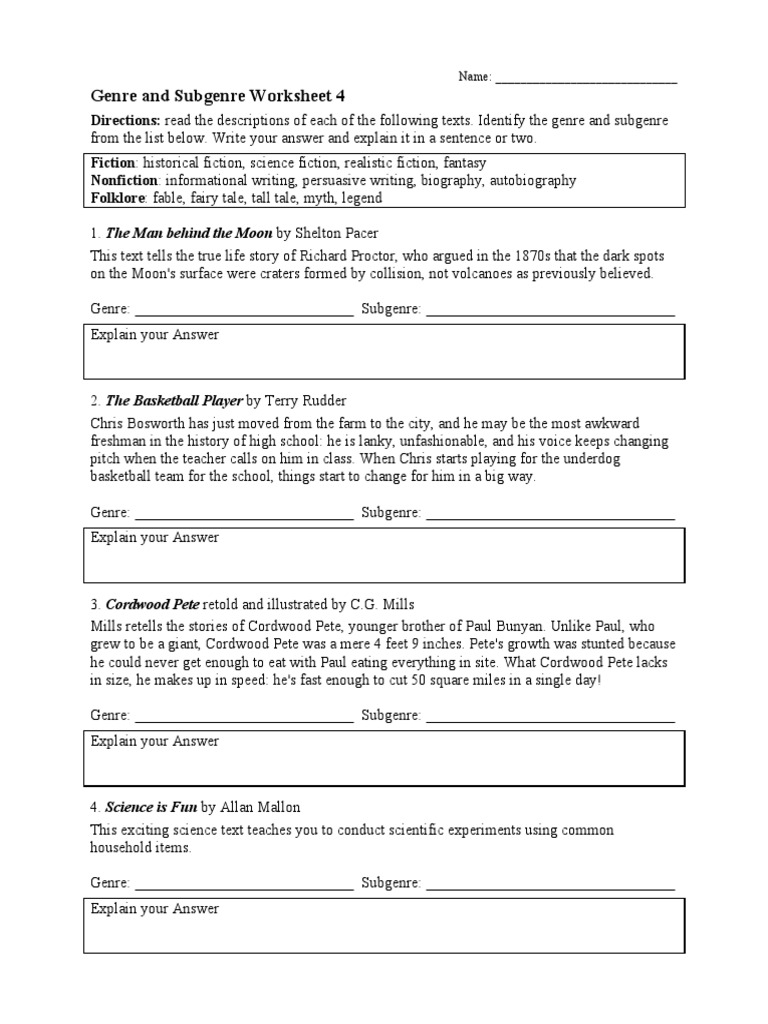 Genre Worksheet 1 Answers | PDF | Rapunzel | Genre genre worksheet 1 answers - Read online for free. ... Read free for 30 days Genre Worksheet Answer Key 1u2ews0 - Identifying ... - StuDocu Intermediate Math Problems for Students by M. Colwell. This workbook text explains how to perform basic mathematical operations, like double-digit addition, subtraction, multiplication, and division. It also explains fractions and decimals.. Genre: nonfiction Subgenre: informational writing. Explain your Answer Provides information about math. Genre Worksheets for 4th Grade Genre Worksheet 1 Answers ... Genre Worksheets for 4th Grade Genre Worksheet 1 Answers Promotiontablecovers one of Worksheet From Home - ideas, to explore this Genre Worksheets for 4th Grade Genre Worksheet 1 Answers Promotiontablecovers idea you can browse by and . We hope your happy with this Genre Worksheets for 4th Grade Genre Worksheet 1 Answers Promotiontablecovers idea. genre-worksheet-01.docx - _ Genre Worksheet 1 Name:... Name: _____ Genre Worksheet 1 Directions: Read the descriptions of the texts. Look for details that reveal the genre. Write the genre and subgenre on the lines and write a sentence explaining your answer. 1. The Hard Way Out by Terry Vaughn In this novel, Brian is struggling.