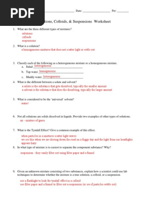PDF Solutions, Colloids, & Suspensions Worksheet Solutions, Colloids, & Suspensions Worksheet 1.What are the three different types of mixtures? 2. What is a solution? 3. Classify each of the following as a heterogeneous mixture or a homogeneous mixture. ... solutions colloids suspensions a homogeneous mixtures that does not scatter light or settle out heterogeneous homogeneous heterogeneous Worksheet Solutions, Suspensions and Colloids questions ... - Quizizz Find and create gamified quizzes, lessons, presentations, and flashcards for students, employees, and everyone else. Get started for free!