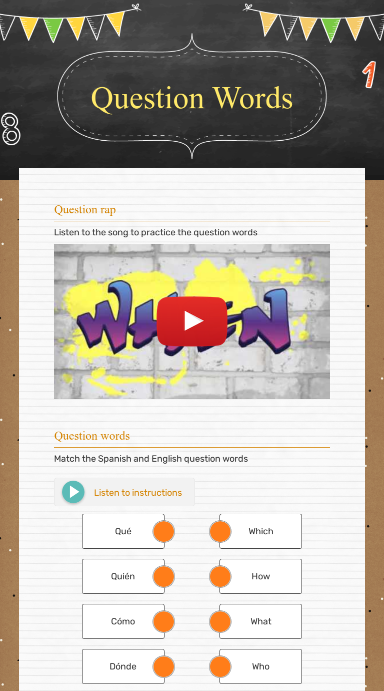 Questions words in Spanish worksheet - Liveworksheets.com Live worksheets > Spanish. Questions words in Spanish. To practise the basic structure of questions in Spanish. ID: 395093. Language: Spanish. School subject: Español como Lengua Extranjera (ELE) Grade/level: Spanish Beginners/ Elementary. Age: 11+.