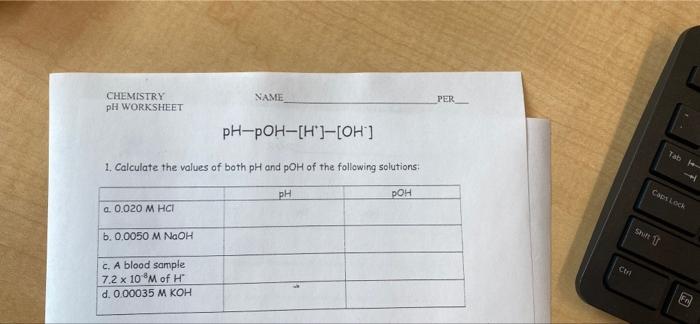 pH WORKSHEET pH WORKSHEET. pH—pOH—[H+]—[OH-]. 1. Calculate the values of both pH and pOH of the following solutions: pH. pOH a. 0.020 M HCl b. 0.0050 M NaOH.