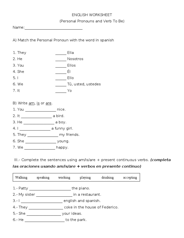 Spanish personal pronouns worksheet