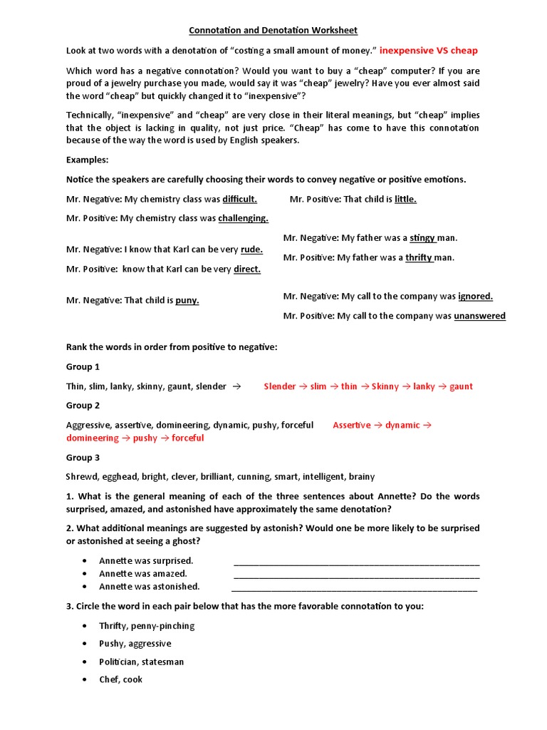 Denotation and connotation worksheet answers. Grammar Exercise on Denotation and Connotation - ThoughtCo Web03/09/2019 · For each word in italics, list two synonyms (words with similar denotations): one with a negative connotation and the other with a positive connotation. In addition to reviewing the glossary entries for denotation and connotation, you may find it helpful to read the introduction to Choosing the Best Words: Denotations and Connotations. › ko1496929ysConnotation and denotation worksheet - Liveworksheets.com ID: 1496929 Language: English School subject: English 4 Grade/level: Grade 4 Age: 9-12 Main content: Connotation and denotation Other contents: Add to my workbooks (25) Download file pdf Citation Machine®: Format & Generate - APA, MLA, & Chicago WebCitation Machine® helps students and professionals properly credit the information that they use. Cite sources in APA, MLA, Chicago, Turabian, and Harvard for free. Connotation And Denotation Worksheet Teaching Resources | TPT Results 1 - 24 of 925 ... Worksheets #1 and #2 include answer keys. Worksheet #3 allows for some differences in answers, so use your discretion :) Subjects:.