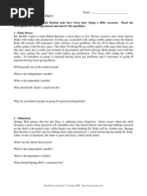 PDF Scientific Method: Controls and Variables Part 1 - MS. AU'S WEBSITE Scientific Method: Controls and Variables - Part 1 Name: _____ SpongeBob and his Bikini Bottom pals have been busy doing a little research. Read the description for each experiment and answer the questions. 1 - Patty Power Mr. Krabbs wants to make Bikini Bottoms a nicer place to live. He has created a new sauce that he
