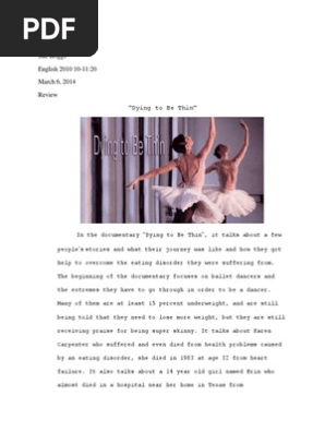 Dying To Be Thin - 525 Words | Bartleby 525 Words. 2 Pages. Open Document. "Dying to be Thin," produced by PBS, is a documentary that examines the troubles that persons who are affected by eating disorders go through and the constant, daily struggles they face with health and body image. The film tells the story of a number of young women who battled mainly anorexia and bulimia ...