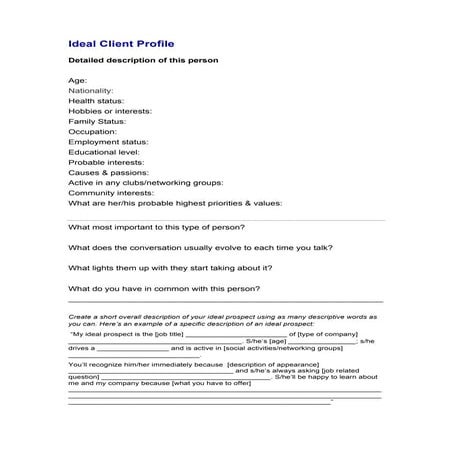Ideal client profile worksheet - SlideShare Nov 23, 2014 · Ideal client profile worksheet 1. Ideal Client Profile Detailed description of this person Age: Nationality: Health status: Hobbies or interests: Family Status: Occupation: Employment status: Educational level: Probable interests: Causes & passions: Active in any clubs/networking groups: Community interests: What are her/his probable highest priorities & values: What most important to this type of person?