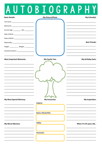Autobiography worksheet - Liveworksheets.com A blank writing frame for writing an autobiography. English English as a Second Language (ESL) Grade/level: Grade 1 Age: 5-10 Main content: All about me Other contents: Link to this worksheet: Copy Finish!!