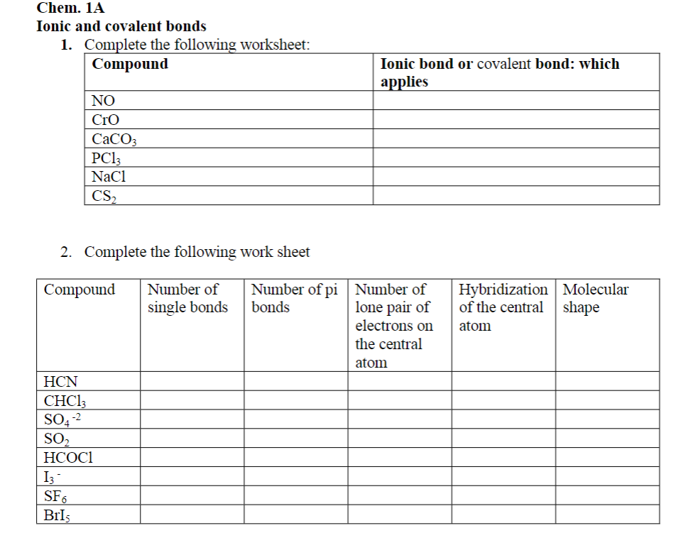 Identifying_Ionic_and_Covalent_Compounds_WS - Course Hero Identifying Ionic & Covalent Bonds Directions: 1. Use your periodic table & notes to complete the assignment 2. Identify the elements in each formula 3. Categorize them as either "metals" or "non-metals" 4. Determine the type of bond each compound has. Formula Metals Non-Metals Type of Bond 1. HF ------ Hydrogen Fluorine Covalent 2. Ionic And Covalent Bond Worksheet Teaching Resources | TPT Identifying Ionic and Covalent Bonds Worksheets by Fireflies and Hot Cocoa 4.9 (10) $1.50 PDF This download includes 20 problems for students to identify whether it is an ionic bond or a covalent bond. Then students color by answer. Teacher Data Tracking Page included. Subjects: Chemistry, General Science, Physical Science Grades: 6th - 10th Types: