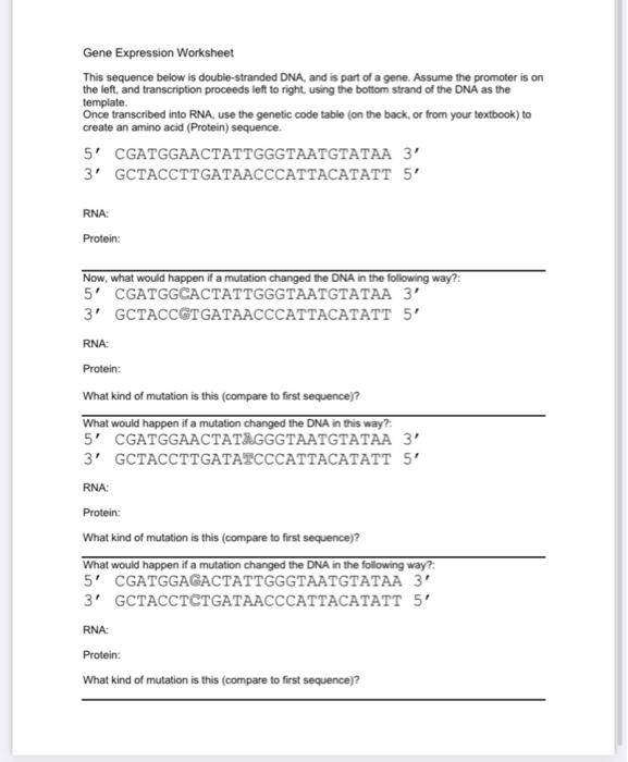 Gene expression worksheet - Assignment Den Transcribe the gene using complementary base-pairing rules and write the correct mRNA (with 5′ and 3′ labels as directed) below the gene. Make sure your RNA nucleotides line up under each DNA nucleotide and that your mRNA contains U, not T when pairing with A. Label this new mRNA with a 5′ on the left side and the 3′ on the right side ...