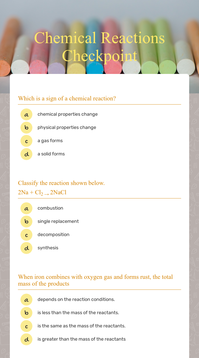 Physical and Chemical Changes worksheets and online exercises Physical and Chemical Changes worksheets and online activities. Free interactive exercises to practice online or download as pdf to print. Advanced search. x. Advanced search. Content: Language: Subject: Grade/level: Age: Search: English - Español. Home; About this site; Interactive worksheets; Make interactive worksheets. Tutorial; Video tutorial; Get started; Make … Physical and Chemical Properties and Changes worksheet ID: 3235038 Language: English School subject: Science Grade/level: 6 Age: 10-12 Main content: Physical and Chemical Properties and Changes Other contents: Add to my workbooks (0) Embed in my website or blog Add to Google Classroom