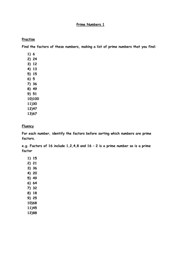 Prime factorization worksheets and online exercises Free interactive exercises to practice online or download as pdf to print. Advanced search. x. Advanced search. ... Prime Factor Tree Worksheet B Grade/level: Grade 5 by Mr_Y_Class: Prime factorization Grade/level: 5 by Lauraalvarezricardo: Prime Factorization Grade/level: 5 by Tayyabanns: Topic 8 Free worksheets for prime factorization / find factors of a number Create an unlimited supply of free worksheets for prime factorization or for finding all the factors of the given numbers. The worksheets are available in both html and PDF formats (both are easy to print), and they come with an answer key on the second page of the file. Each worksheet is randomly generated and thus unique.