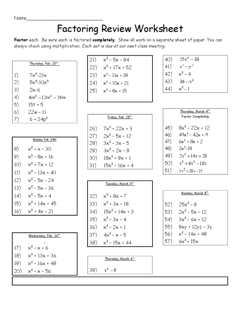 Algebra 2 Factoring Review Teaching Resources | Teachers Pay Teachers Algebra 2 End of Year Review Activity: Factoring Math Sprint! is an activity that helps students become fluent with a specific skill! ... They work the same problems, but will end up with different designs. Prior to this worksheet we cover factoring by guess & check, grouping, splitting the middle, and the box method. I include "boxes" for ... factoring test review - Algebra 2 6.4 Worksheet- Factoring... View Notes - factoring test review from MAT 88 at Three Rivers Community College. Algebra 2 6.4 Worksheet- Factoring Review for Quiz Name:_ Hour:_ Factor the