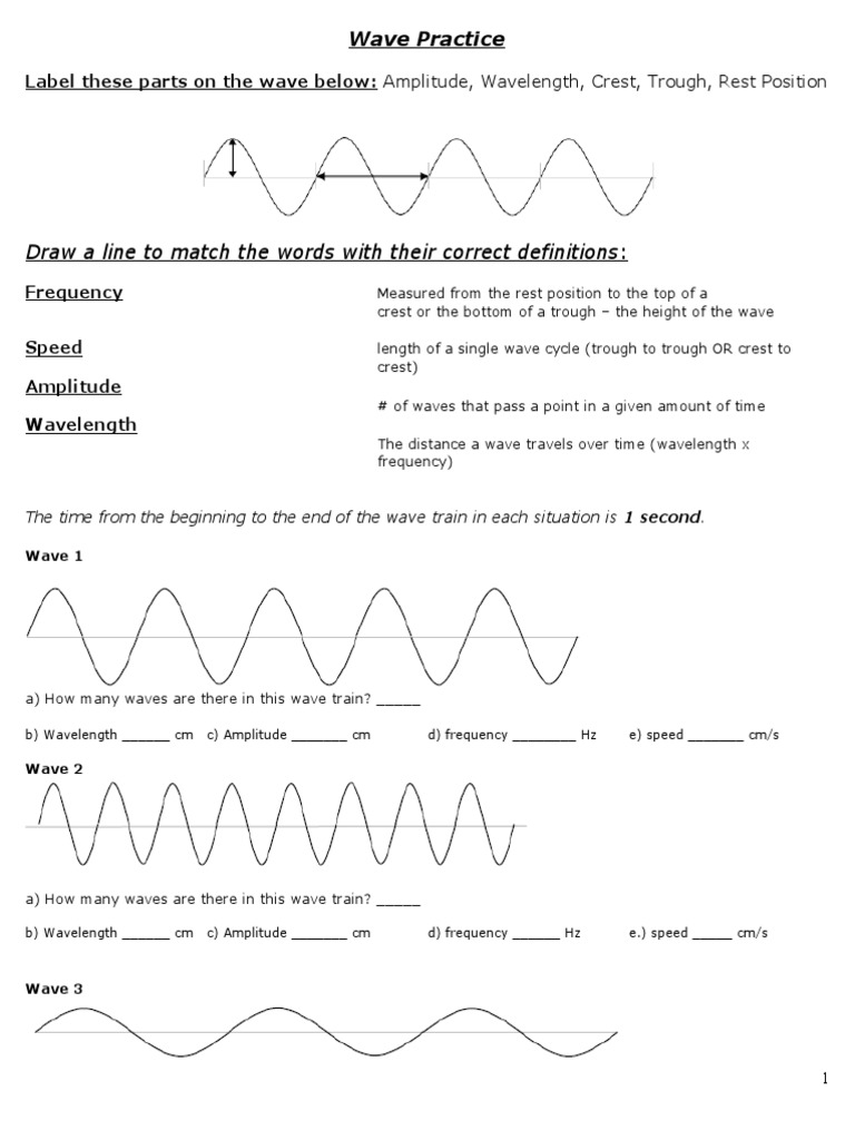 PDF Waves #2 Worksheet Answers - Paulding County School District Waves Worksheet #2 A:___Crest_____ B:___Wavelength_____ C:___Amplitude_____ D:___Trough_____ E:___Wavelength_____ F:___Amplitude_____ Frequency Wave 1: Wave 2: Wave 3: Frequency Connection There are three members of a family. The dad has a deep, low voice. The mom has a medium-high voice, and the baby has the highest voice. 8.