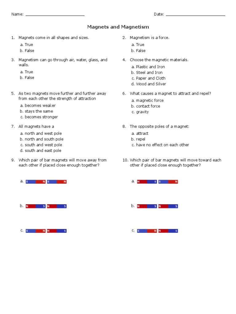 Magnets and magnetism worksheet. Magnet Worksheets Teaching Resources | Teachers Pay Teachers Results 1 - 24 of 7793 ... Are you looking for worksheets and reading passages for magnets and magnetism? This magnets unit is a perfect supplemental resource to ... Lesson Worksheet:Properties and Uses of Magnets - Nagwa In this worksheet, we will practice describing the properties of magnets, the poles of a magnet, and the magnetic field and making a compass. Exploring 2 Bar Magnets Differentiated Worksheets - Twinkl Magnet have two 'poles' - one 'North and one 'South'. When the same poles of two or more magnets are placed together they will repel one another. This is ... Magnetism worksheets and online exercises - Liveworksheets.com Interactive worksheet Magnet. Magnet Grade/level: Pre K KG by we_care_about_our_children. Interactive worksheet Week 24 - Science - Magnetism.