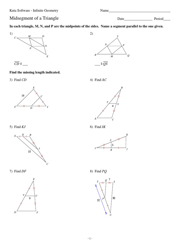 PDF Midsegment of a Triangle Date Period - Kuta Software R P xA4lel e ar Oi Lg1h ktVsw 9rEeSsNe Orovue YdI. m C PMpad7e5 1w Ki OtAhY RI7n RfGian CintXe2 dG 2e Goum KeMtcr qyD. h Worksheet by Kuta Software LLC Kuta Software - Infinite Geometry Name_____ Midsegment of a Triangle Date_____ Period____ In each triangle, M, N, and P are the midpoints of the sides.