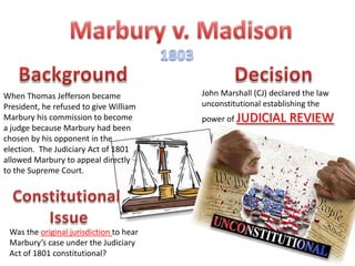 Marshall Court Cases Flashcards | Quizlet Marbury v. Madison Summary: Madison refused to give Marbury his commission because he was a federalists Decision: Marshall decided that the law passed by Congress was unconstitutional Impact: Created the precedent of judicial review Fletcher v. Peck Summary: Georgia passed a land grant to an individual and there was a situation regarding contracts