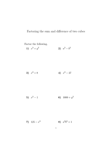 Factoring Sum and Difference of Two Cubes: Practice Problems Factoring Sum and Difference of Two Cubes: Practice Problems Direction: Factor out each binomial completely. Work it out on paper first then scroll down to see the answer key. Problem 1: {x^3} + 216 x3 + 216 Problem 2: 2 {x^3} - 16 2x3 − 16 Problem 3: 64 {x^3} - 27 {y^3} 64x3 − 27y3 Problem 4: 3 + 81 {x^3} {y^3} 3 + 81x3y3 Sum And Difference Of Cubes Worksheets - Learny Kids Some of the worksheets for this concept are Factoring a sumdifference of cubes, Factoring the sum or difference of cubes, Sum and difference of cubes practice work, Factoring the sum or difference of two cubes, The sum and difference of two cubes, Special factoring formulas, Angle sumdifference identities, Factoring binomials. sum and difference of cubes worksheet The trinomial factor in the sum and difference of cubes pattern cannot be factored. It can be very helpful if you learn to recognize the cubes of the integers from 1 to 10, just like you have learned to recognize squares. We have listed the cubes of the integers from 1 to 10 in the figure below.