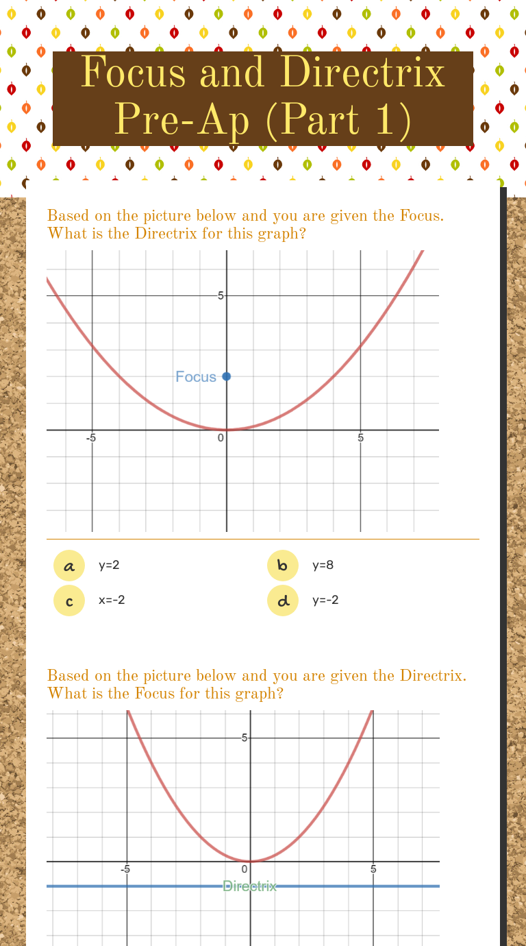 Focus and Directrix Worksheets The point where the plane interacts with the exterior surface of the parabola is known as the vertex. In the figure shown above, the point present on the axis of the symmetry with the right angle is known as the focus. The straight-line present on the opposite side of the parabolic curve is known as the directrix. Focus And Directrix Teaching Resources | Teachers Pay Teachers This is 2 worksheets on parabolas focusing on the directrix and the focus. 1 - Determining the equation of a parabola given the focus and the directrix. There are also some review questions of simplifying radicals and writing equations. (10 questions total) 1 - Graphing the parabola and determining the vertex, directrix, and focus of each problem. Focus and Directrix of a Parabola - mathwarehouse The red point in the pictures below is the focus of the parabola and the red line is the directrix. As you can see from the diagrams, when the focus is above the directrix Example 1, the parabola opens upwards. In the next section, we will explain how the focus and directrix relate to the actual parabola. Explore this more with our interactive app below.
